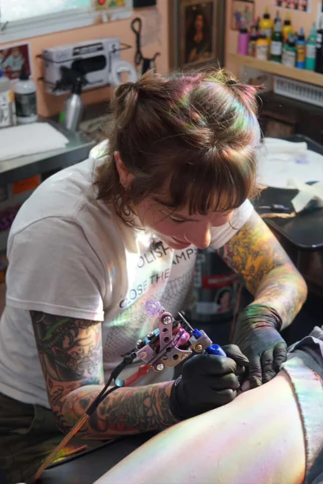 Olivia "OP" Toris tattooing Green, photo by Miranda Larson