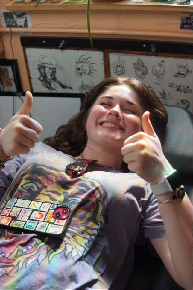 Miranda Larson tattooing Olivia "OP" Toris at Wearhouse