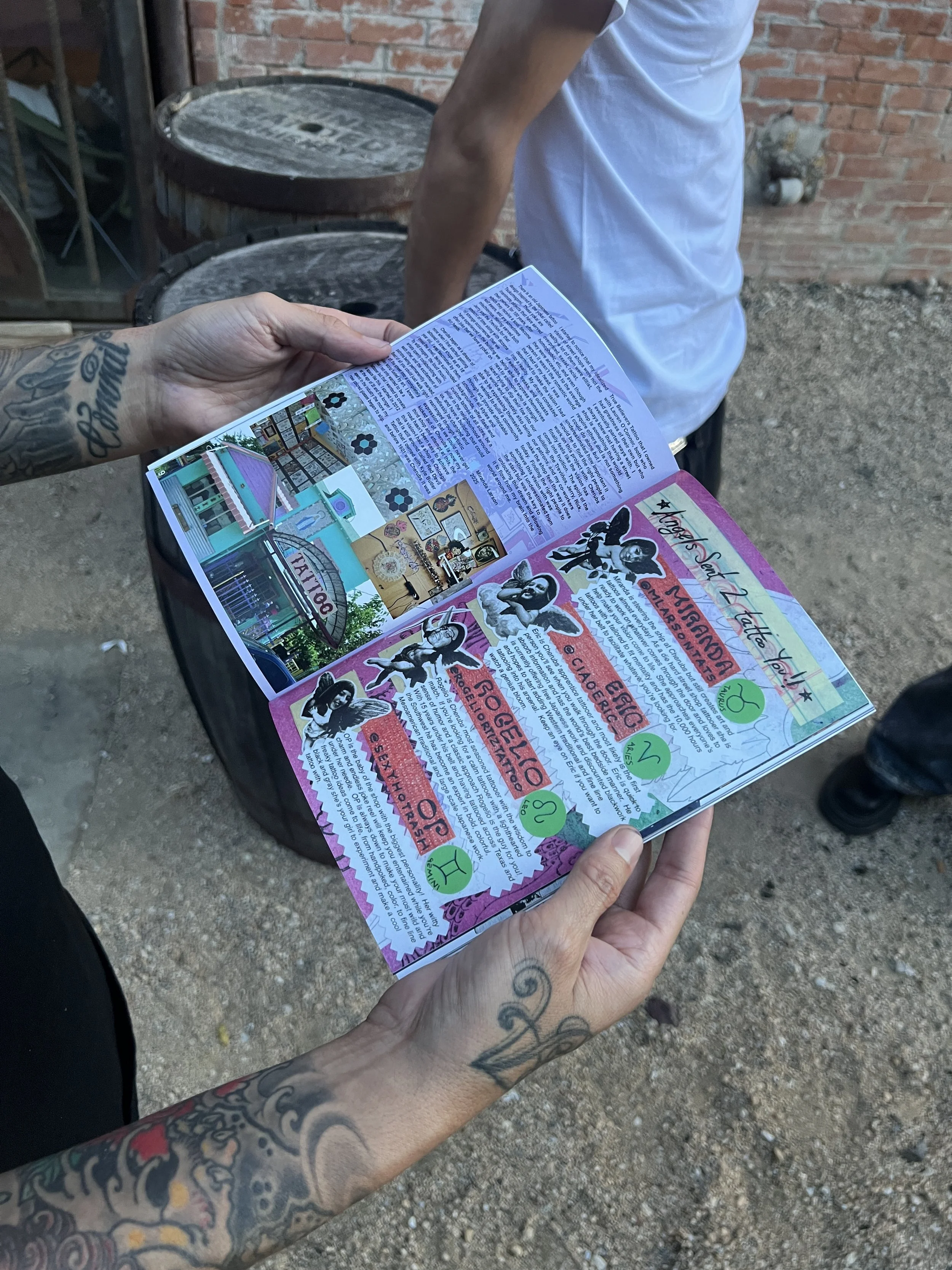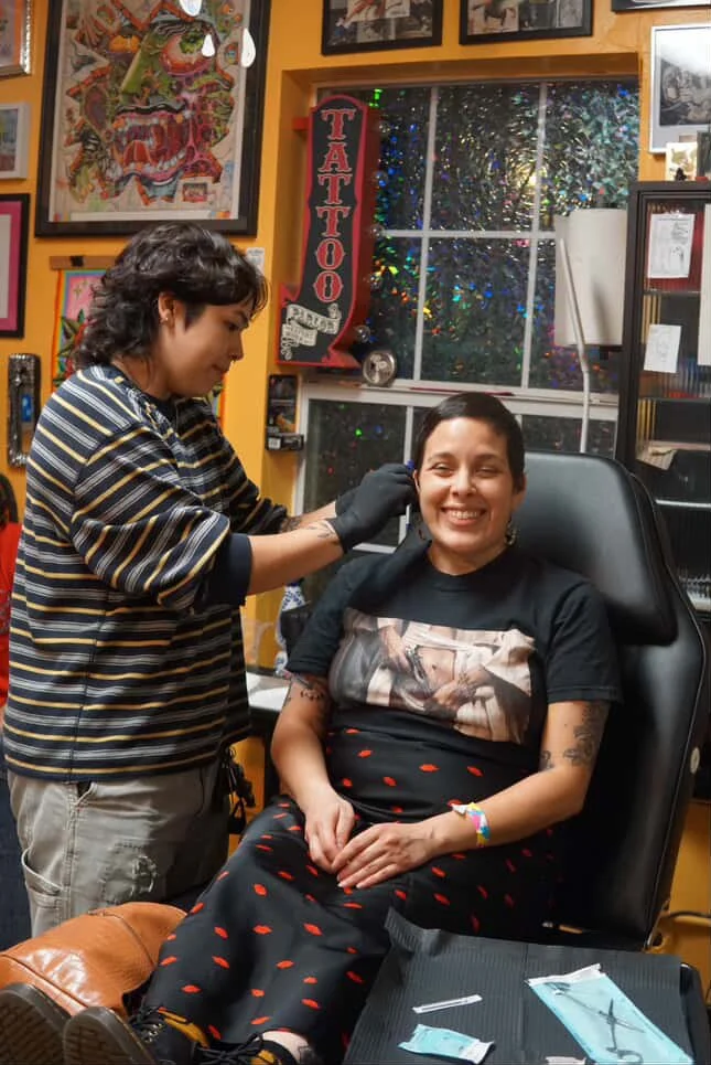 Kai Treviño and Olivia "OP" Toris tattooing Rio, photo by Miranda Larson