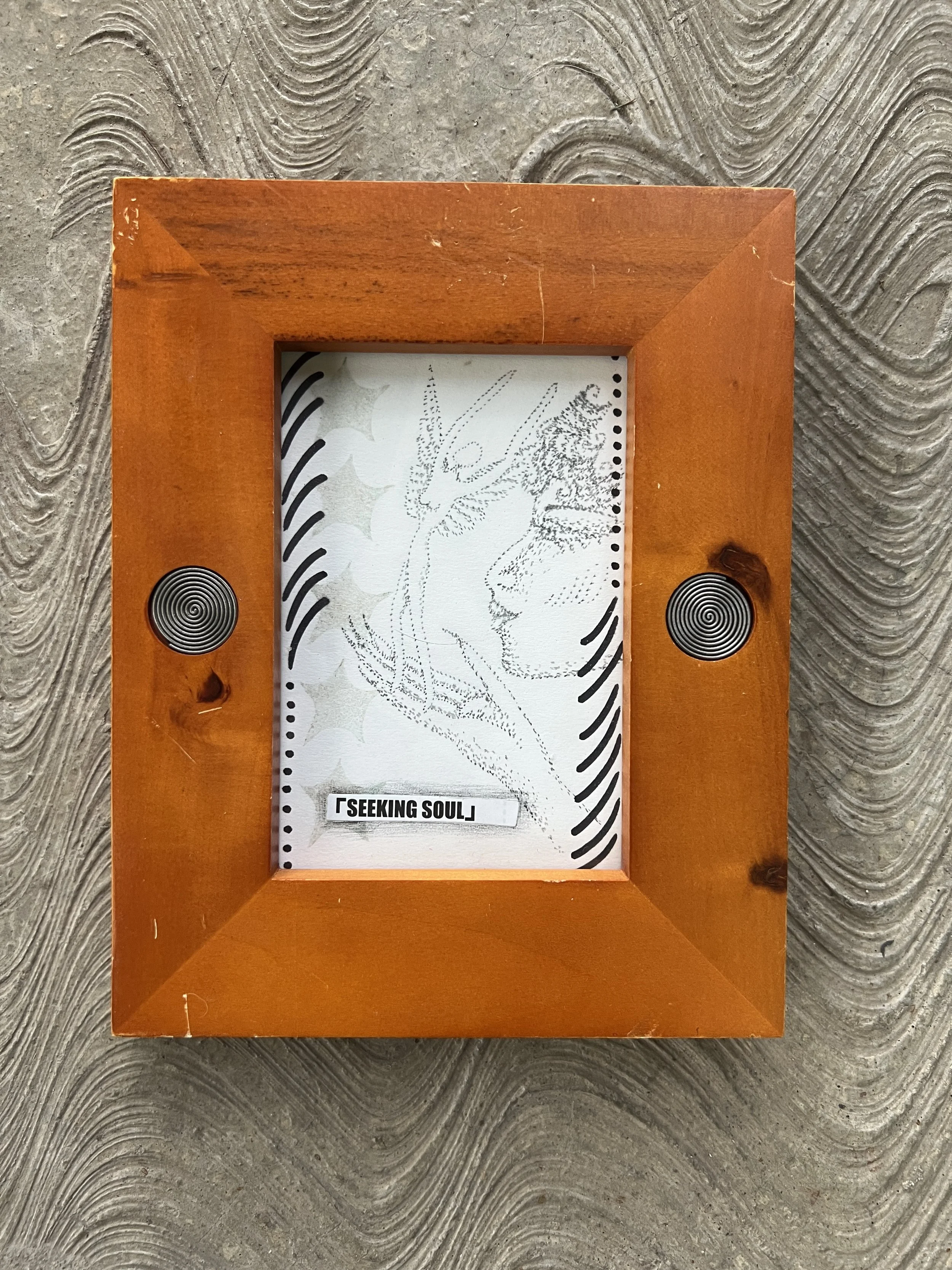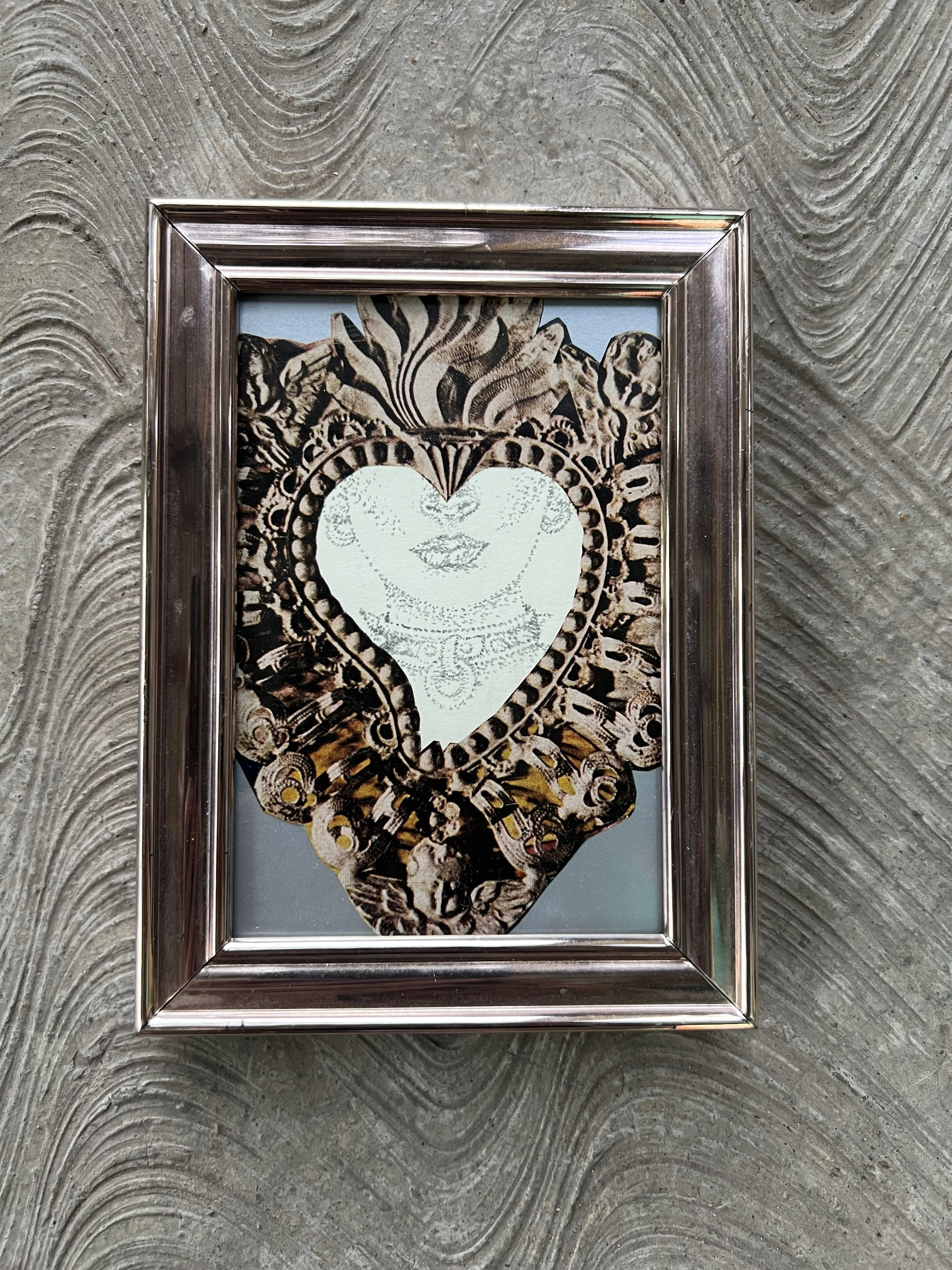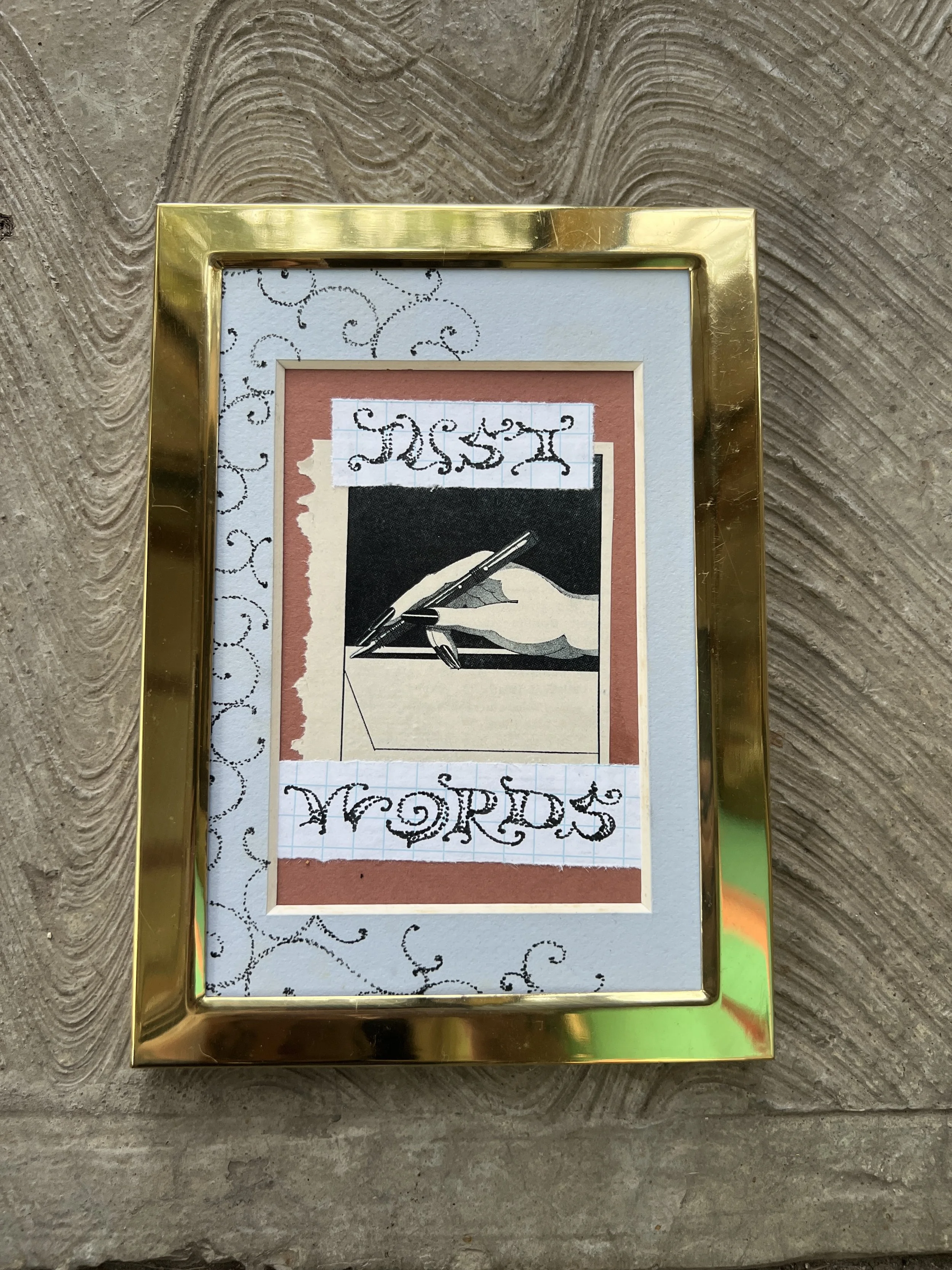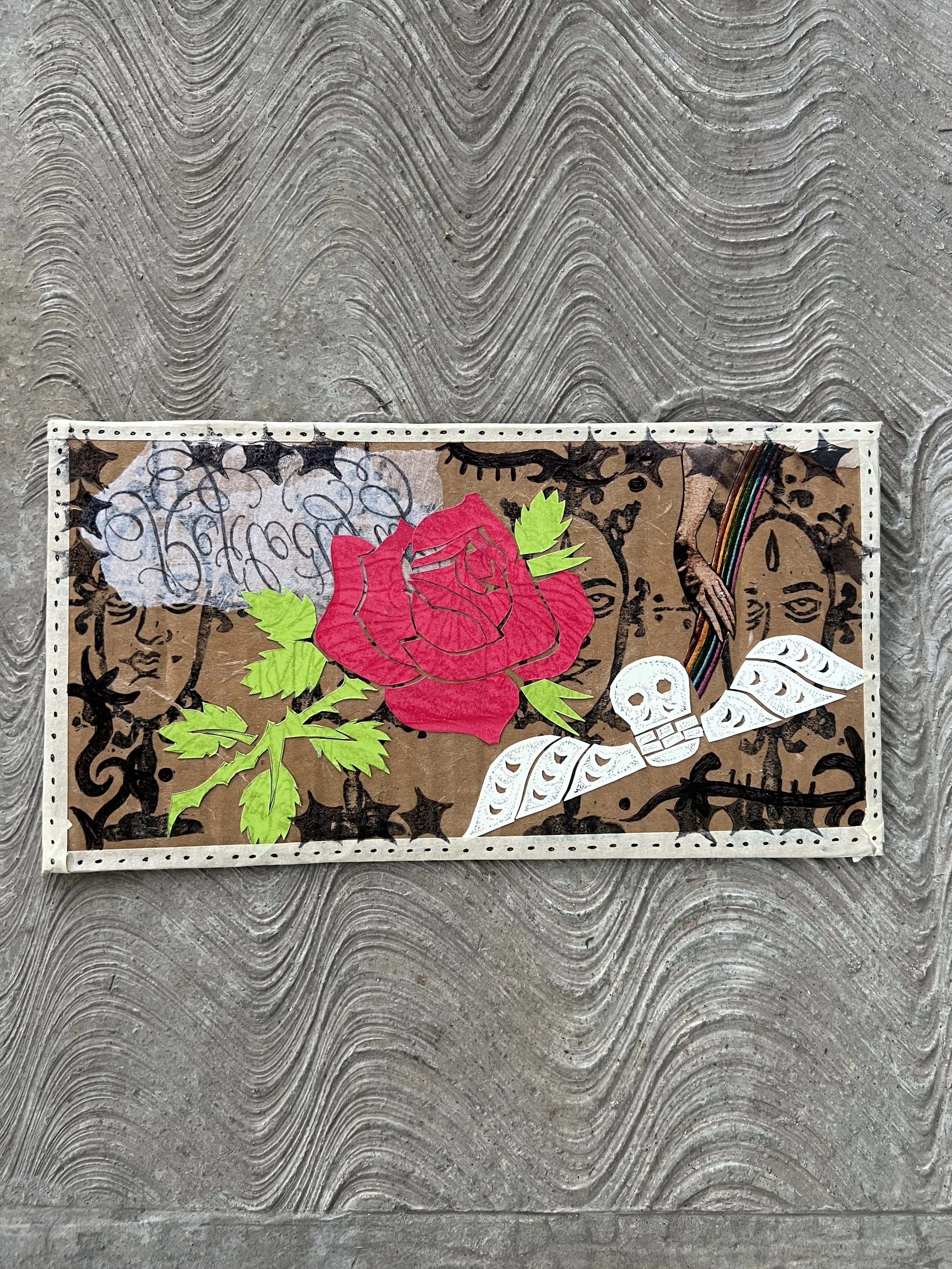 Collaged paper, micron, pencil, dried flower petals, baggie