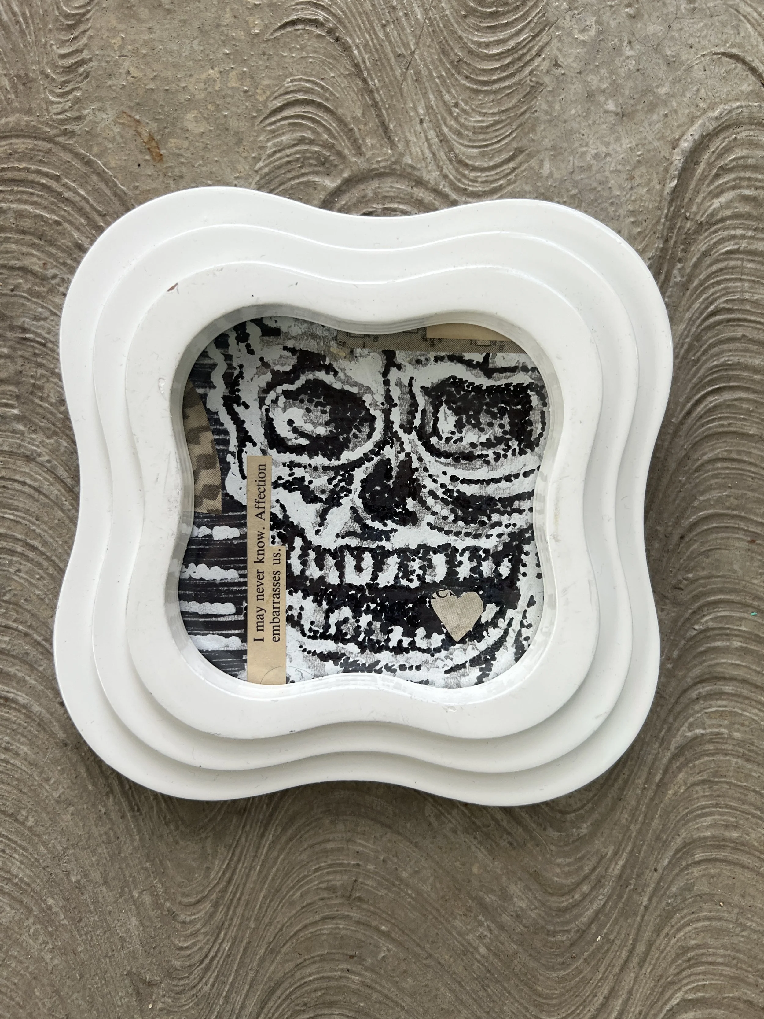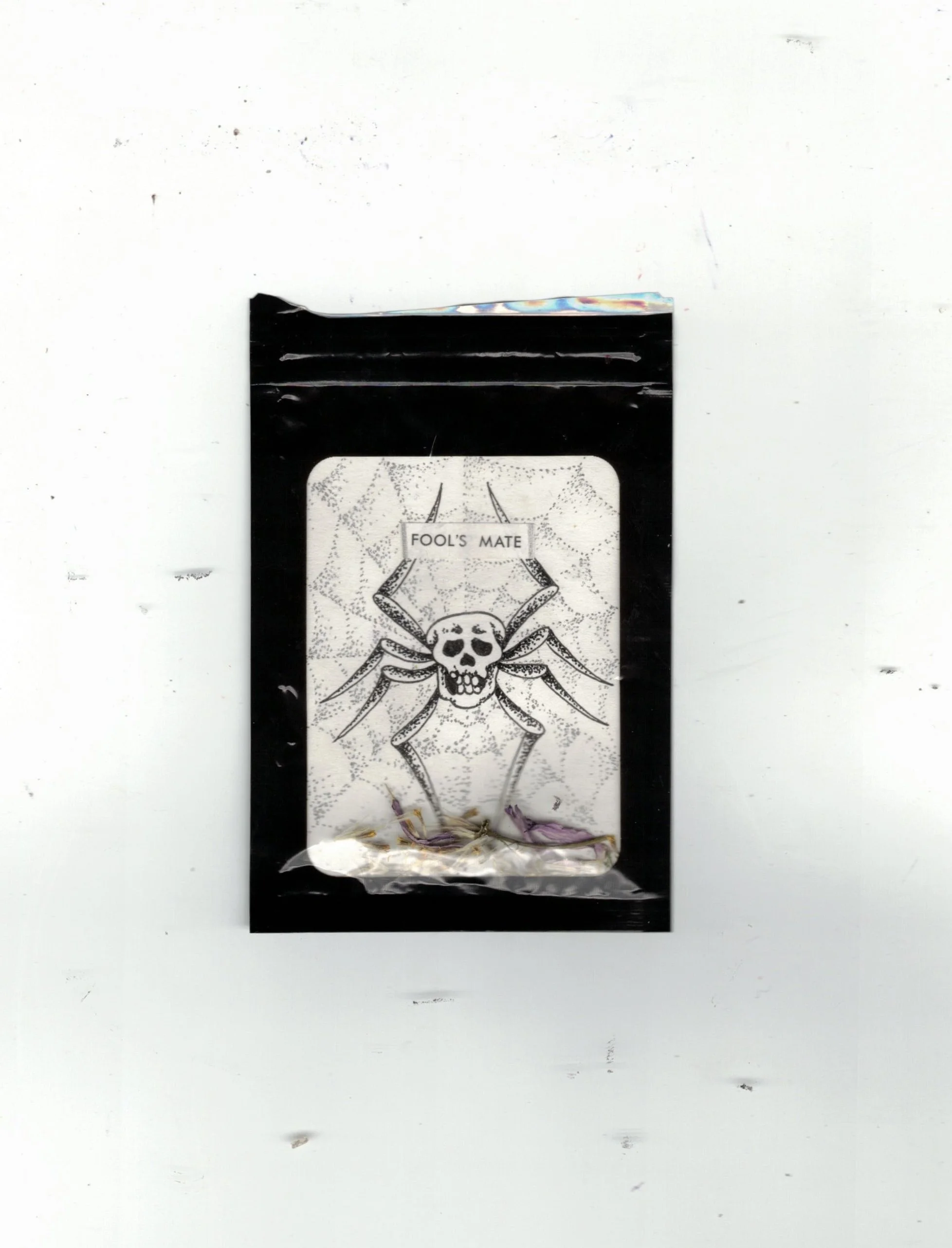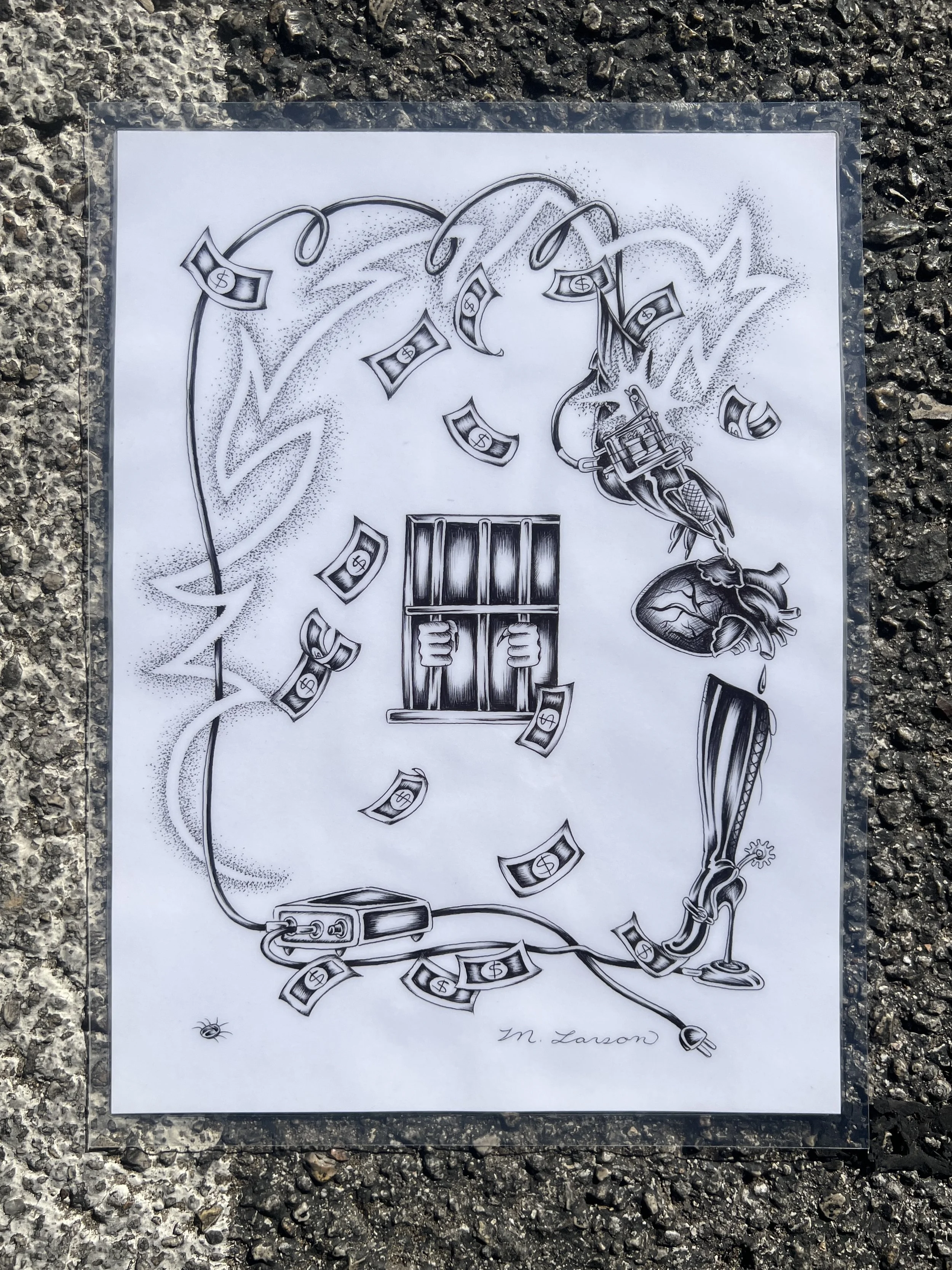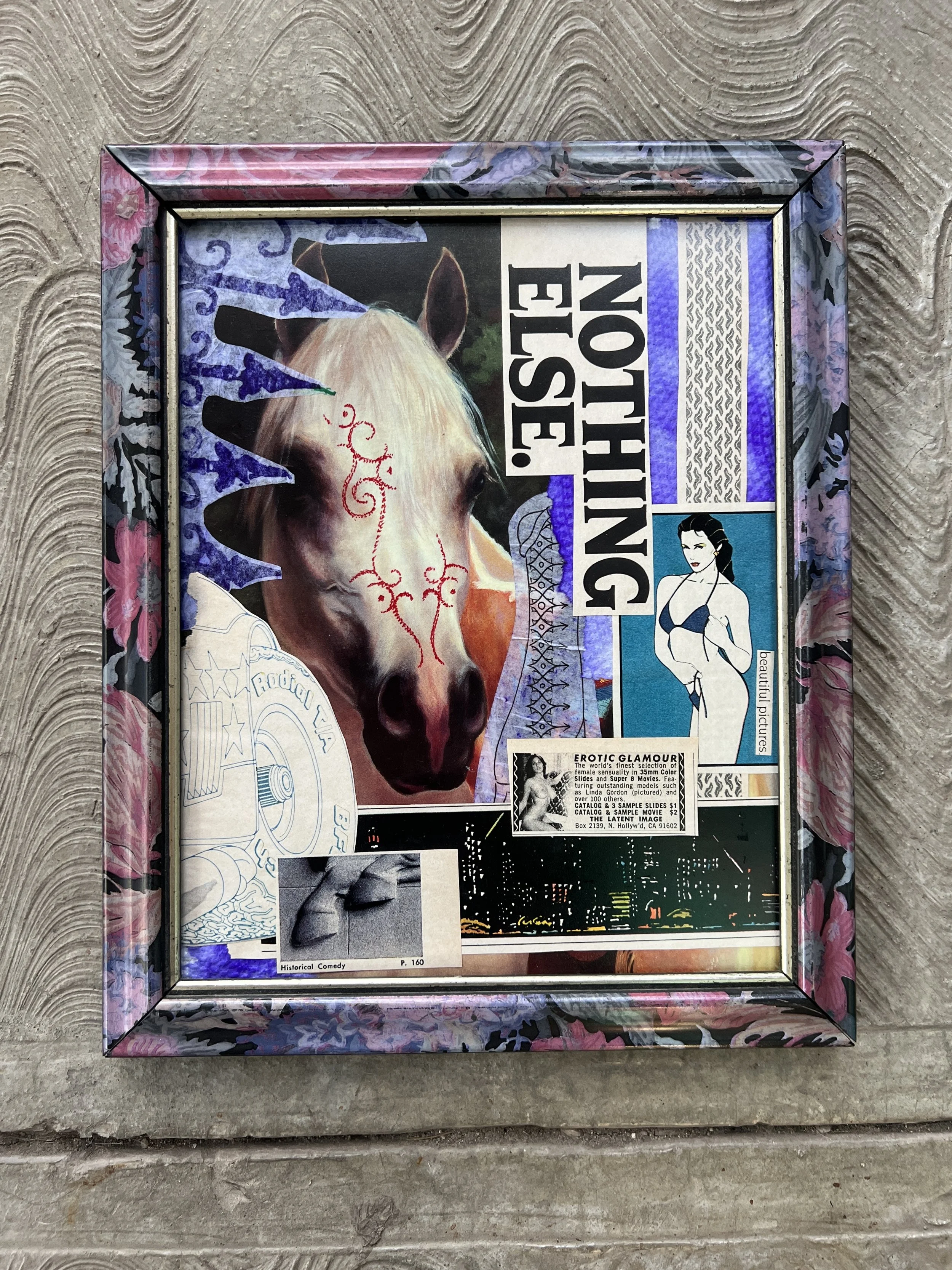 Collaged paper, micron, pencil, dried flower petals, baggie