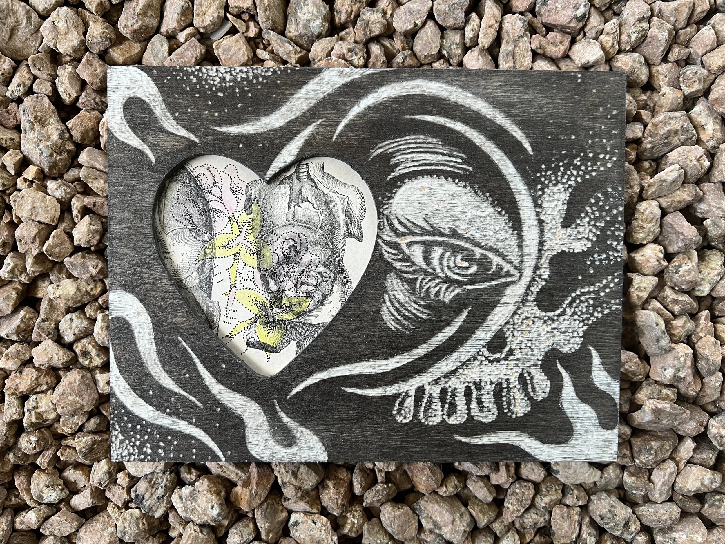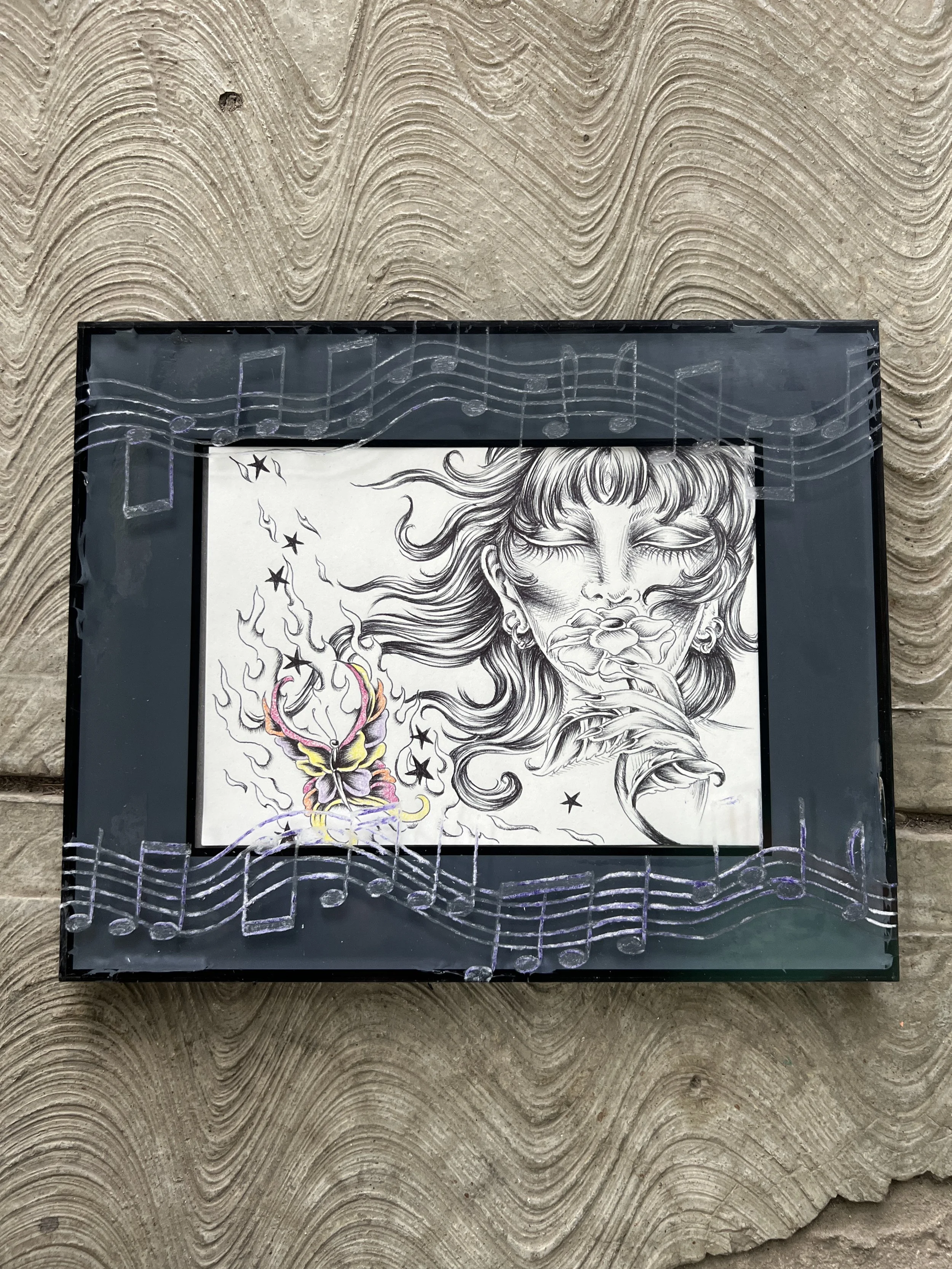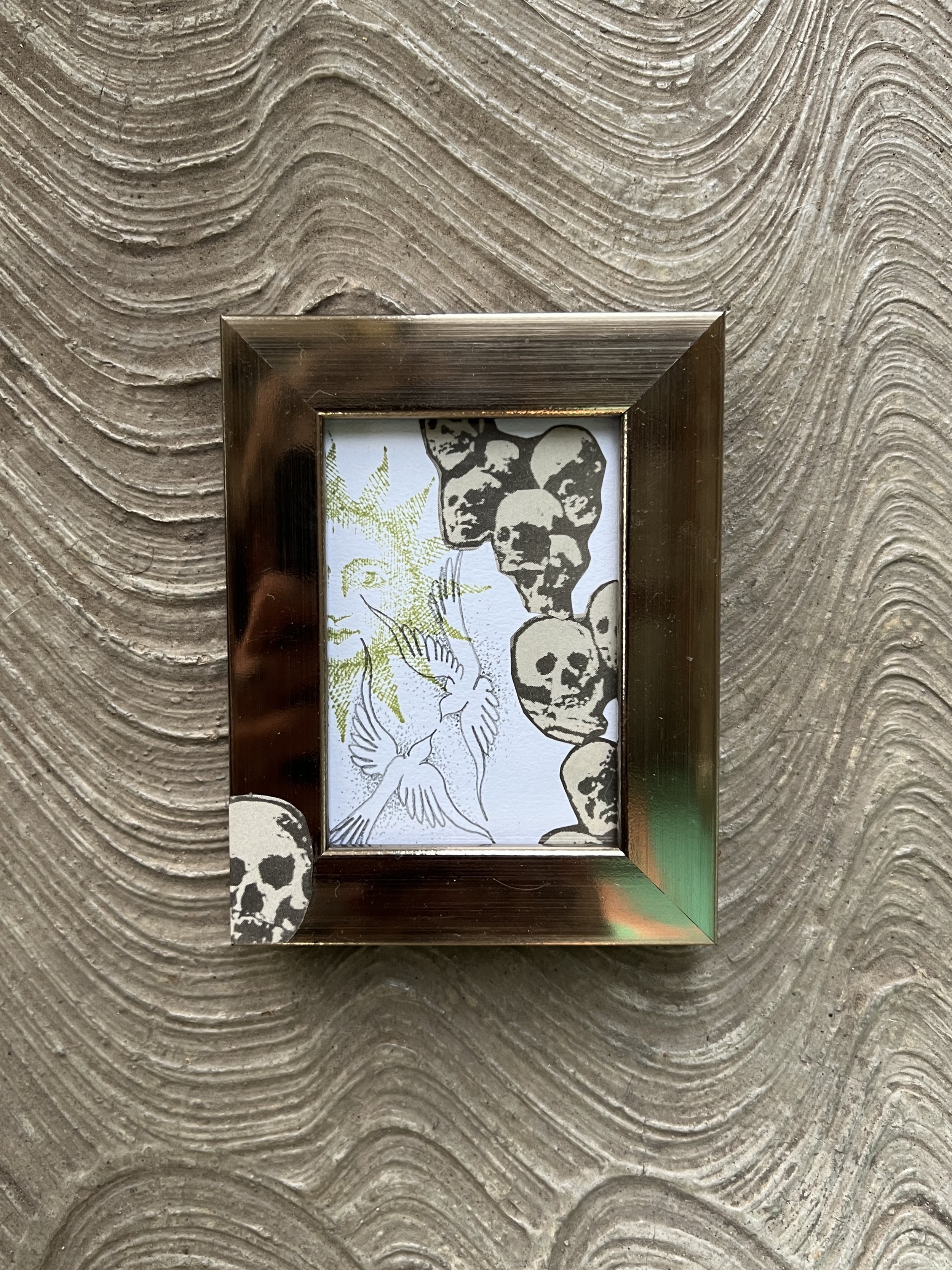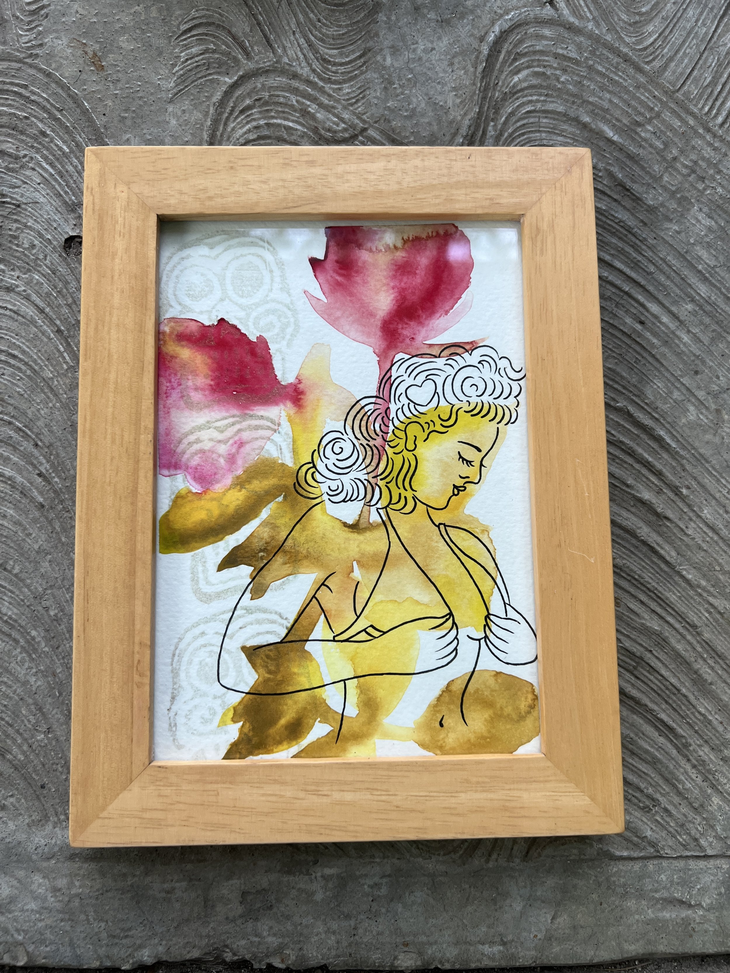 Collaged paper, micron, pencil, dried flower petals, baggie