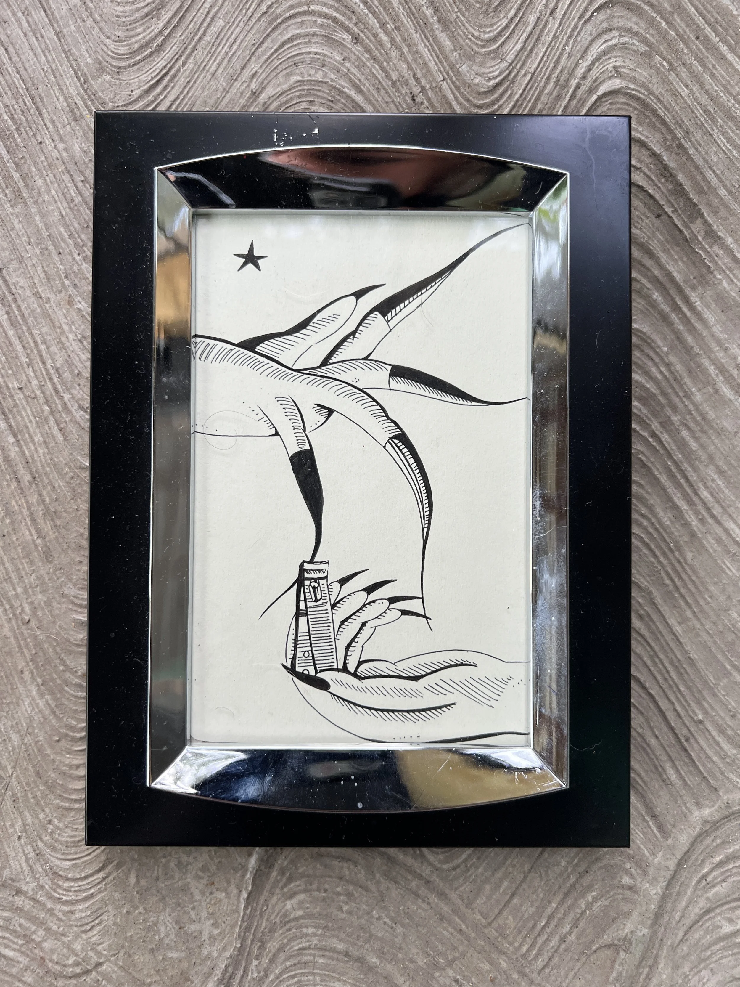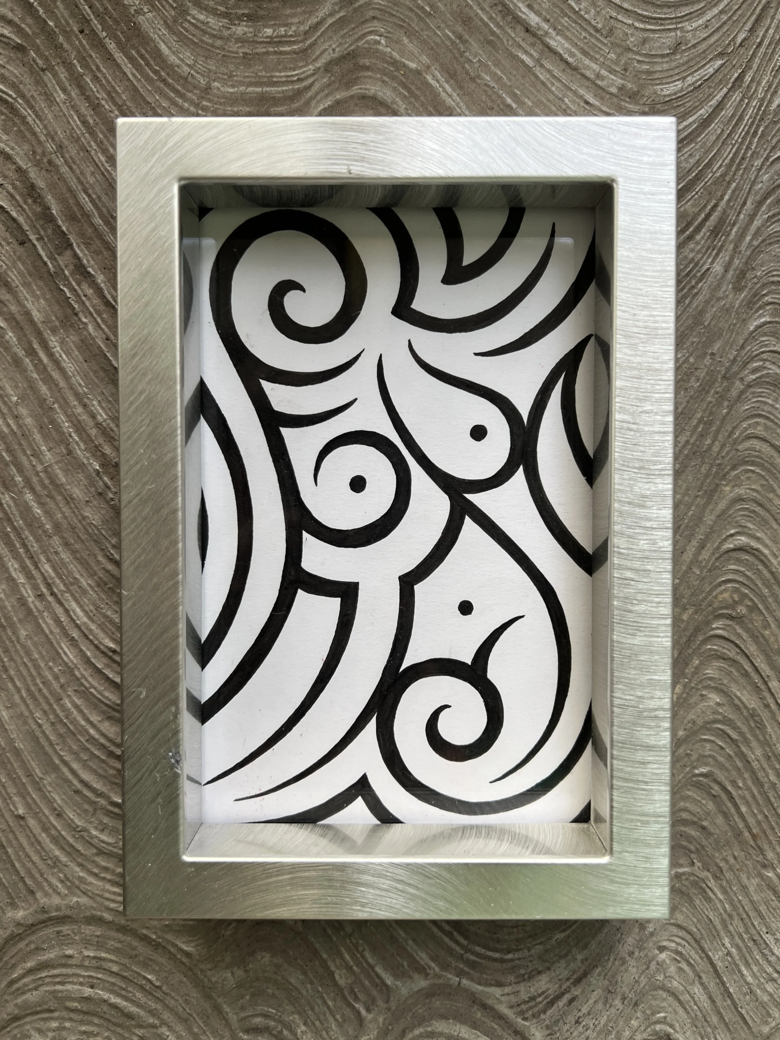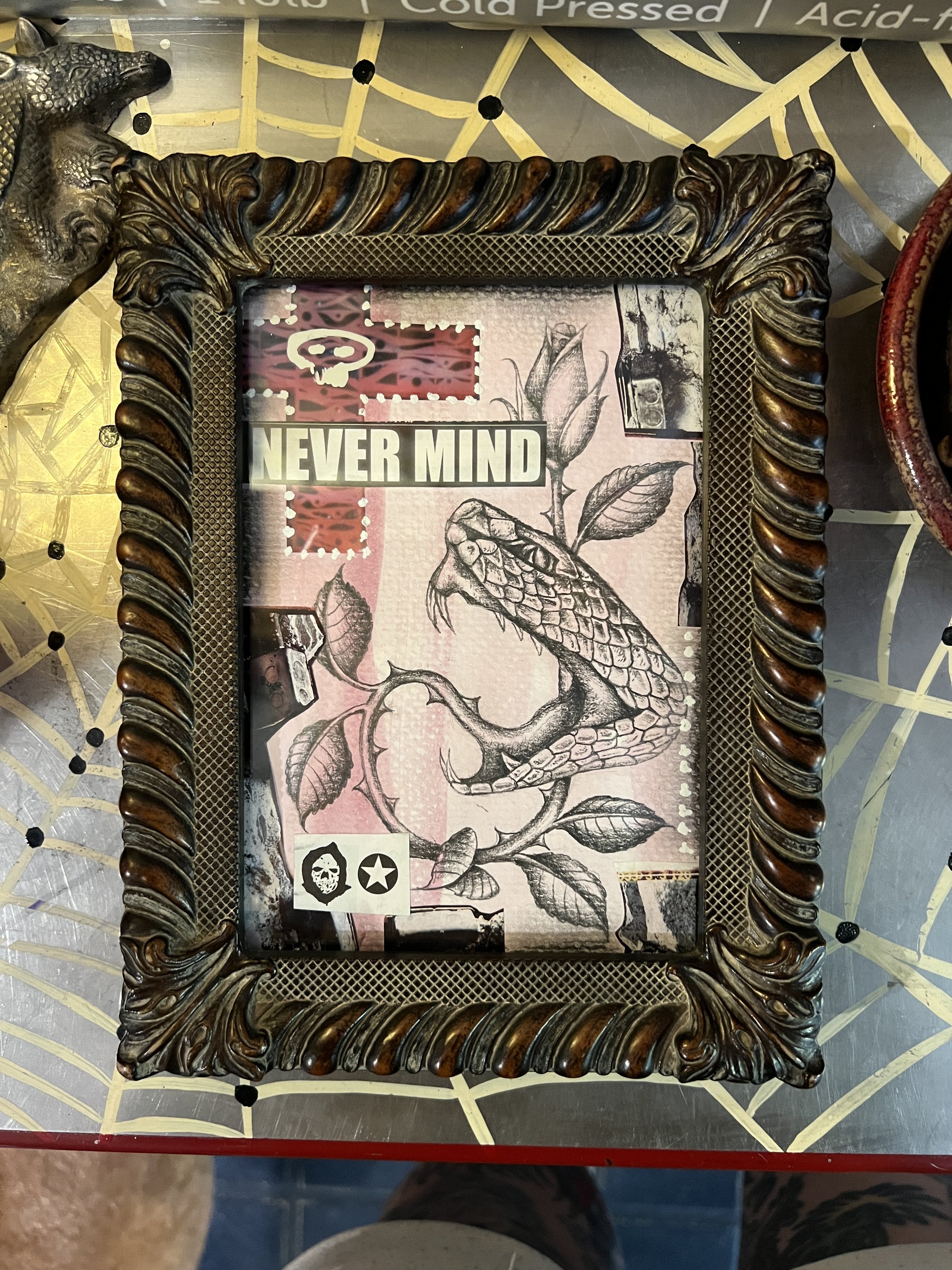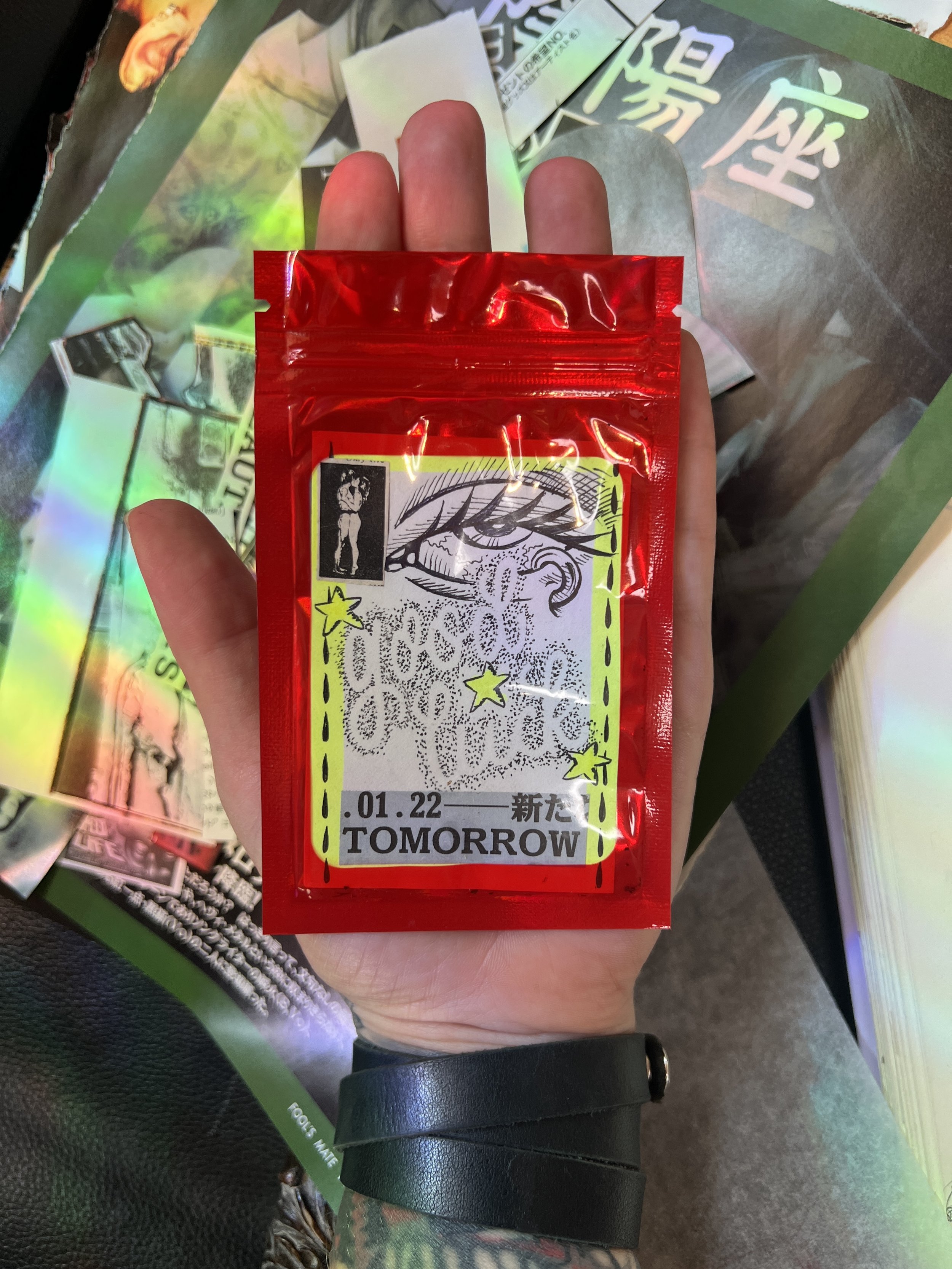 Collaged paper, micron, pencil, dried flower petals, baggie