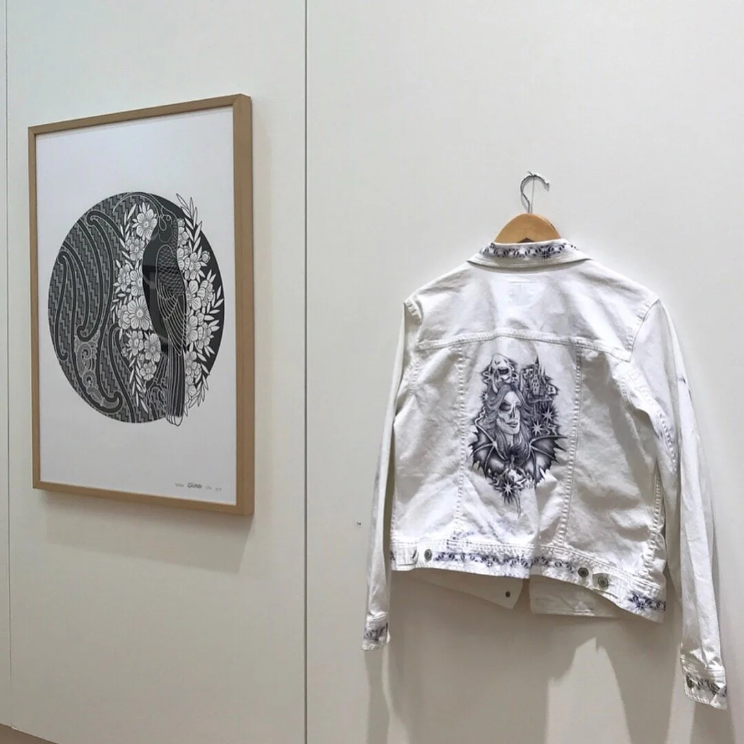 Watercolor, found paper, pencil, ink, acetate, binder clips, denim