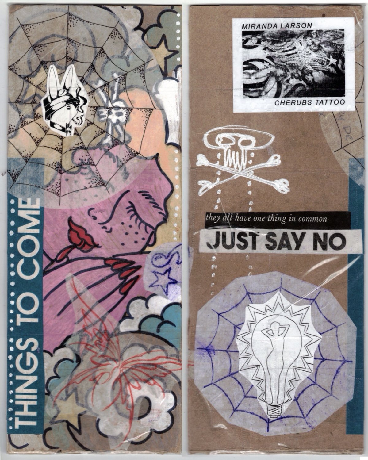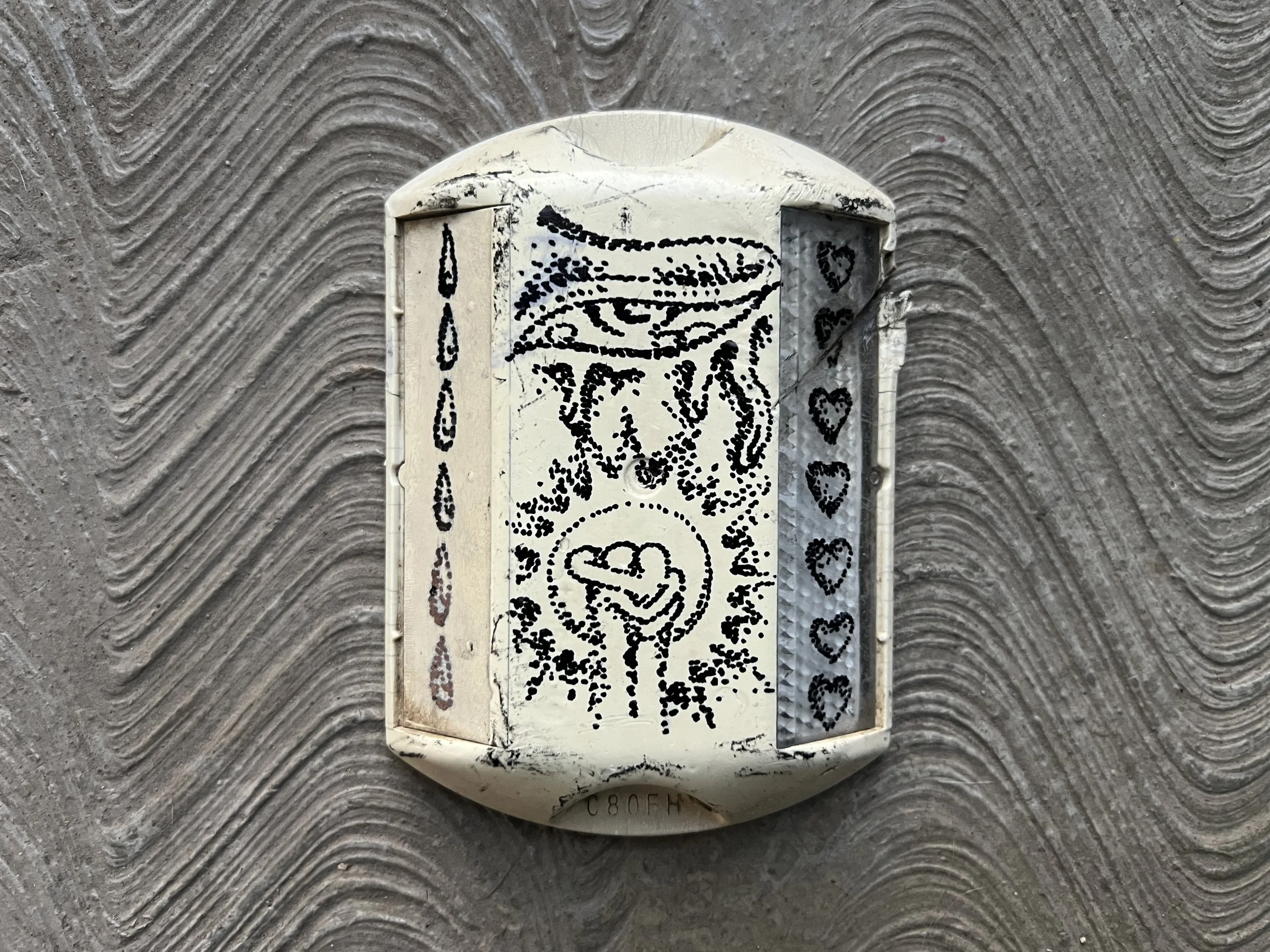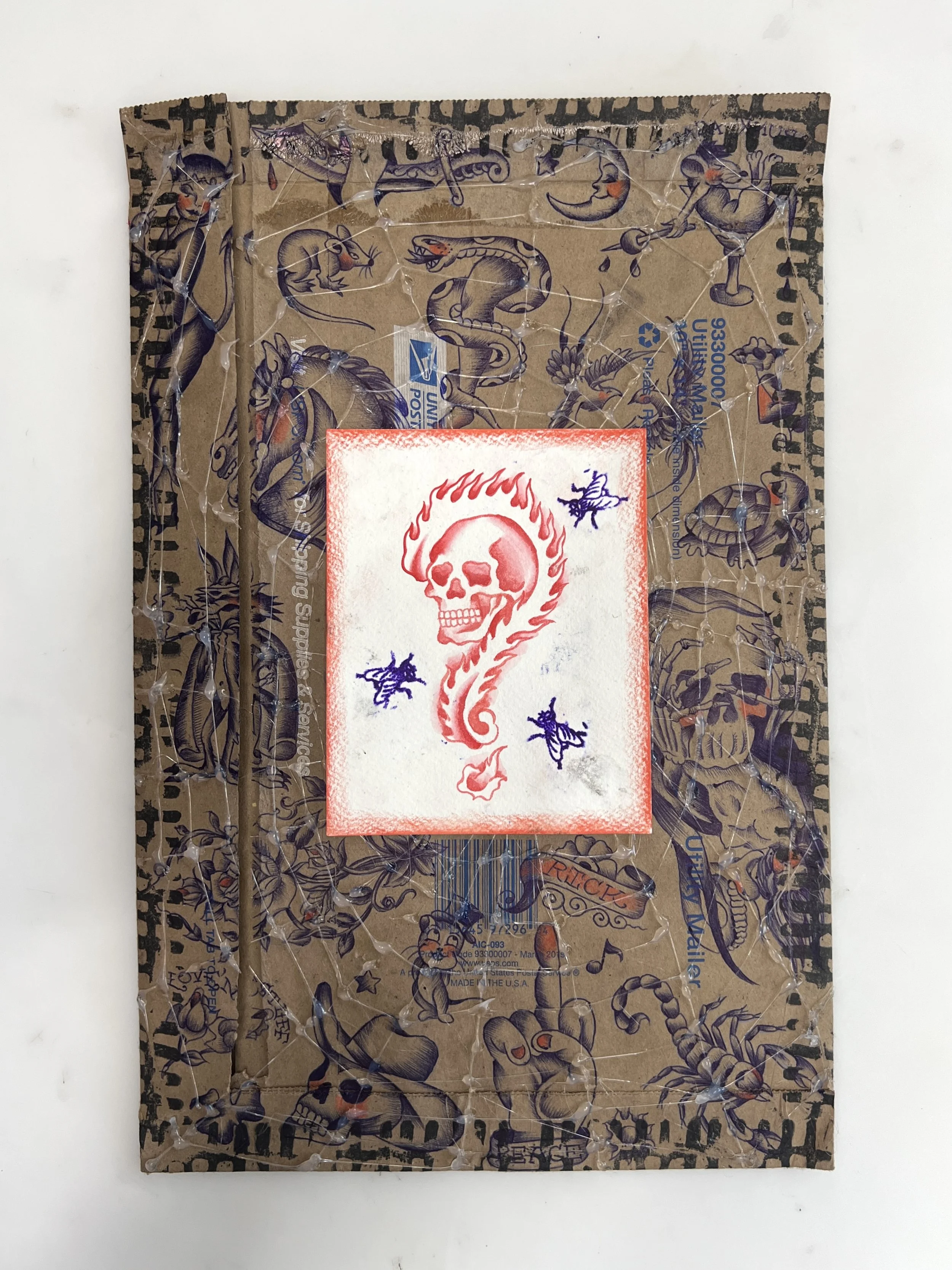 Envelope, glue, ballpoint pen, pencil, watercolor, ink
