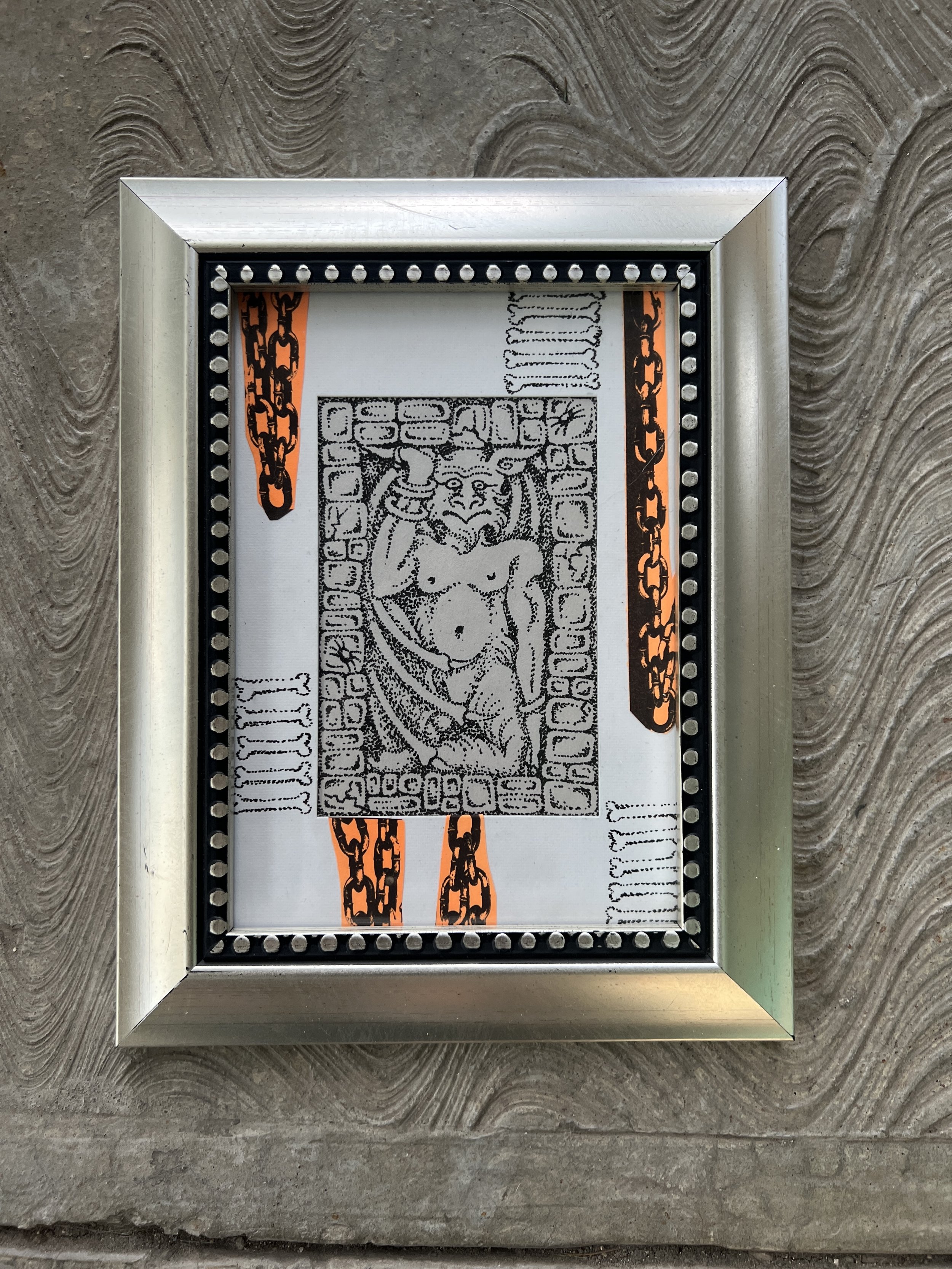 ink, acrylic paint, colored pencils, chalk pastel, pencil, and stamp on drawing paper