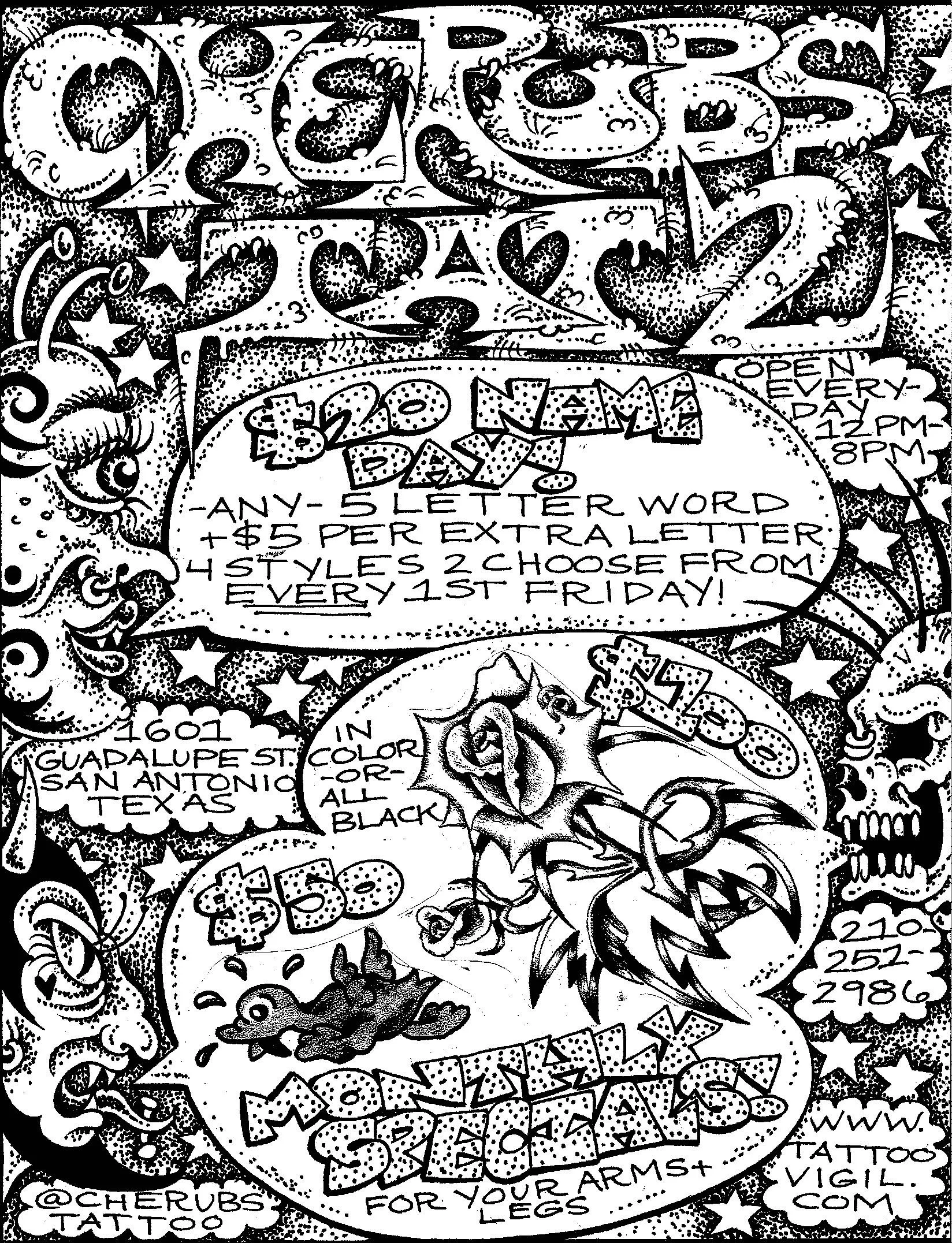 Every first Friday Cherubs hosts name day! Any 5 letter word is $20, and $5 for each additional letter. We have 4 lettering styles to choose from and these can be tattooed with bold or fine lines and can be done on the arms, legs, or back. This is a walk-in based special so no appointment is necessary.